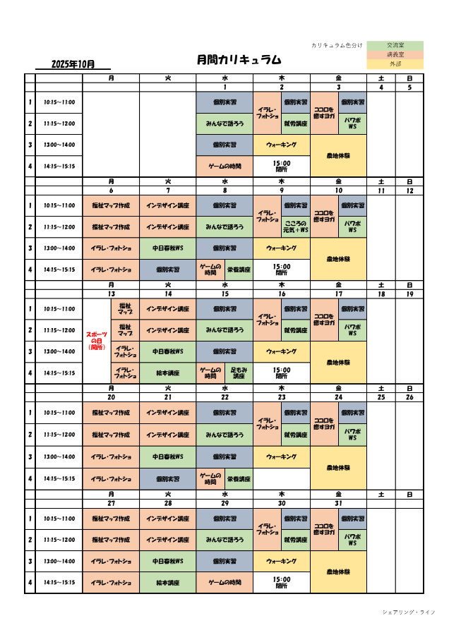 就労を目指し、シェアリング・ライフに通いながらカリキュラムを通してこれらのことを身につけていきます。